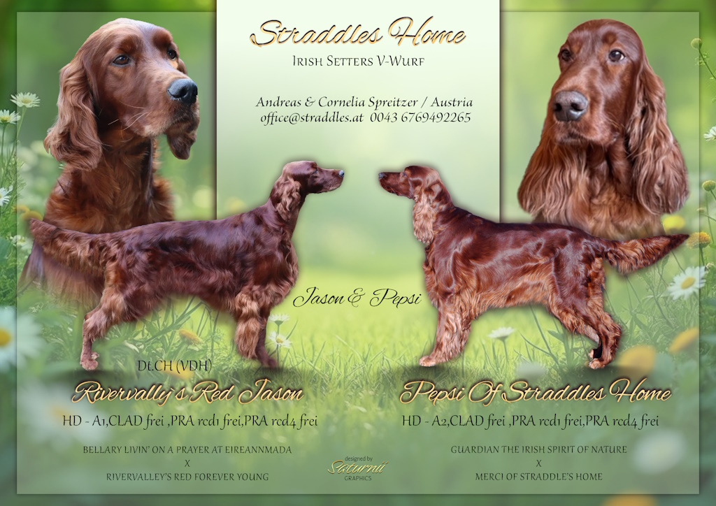 Nachdem wir mit unsren beiden Hunden alle Anforderungen eines gesunden, wesensfesten Setters laut Zuchtordnung des Österreichischen Setter Clubs gerecht wurden, ließen wir im Jahr 2005 unseren Zwinger“…of Straddle’s home“ eintragen.